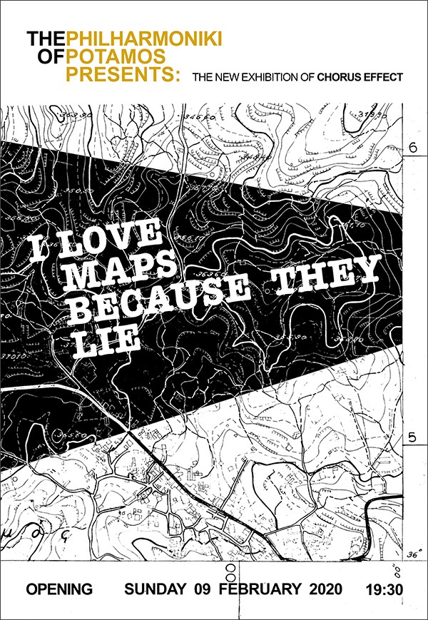 The hall of Philharmoniki in Potamos will be open every Sunday from 11 a.m. το 2 p.m for those who would like to visit the new exhibition ” I Love Maps Because They Lie” of the artistic team “Chorus Effect”.