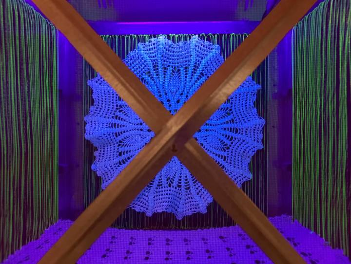Η σύνδεση μεταξύ των δύο τμημάτων του έργου, του παρελθόντος και του παρόντος, είναι ο εξελισσόμενος αργαλειός-γλυπτό, που ξεκίνησε από μια υφασμένη γραμμή από χειροποίητο και παραδοσιακά βαμμένο μάλλινο νήμα και συνεχίζει να ξεδιπλώνεται καθ’ όλη τη διάρκεια της έκθεσης με τη συλλογική ύφανση από τους επισκέπτες και όσους καταπιάνονται με αυτήν.