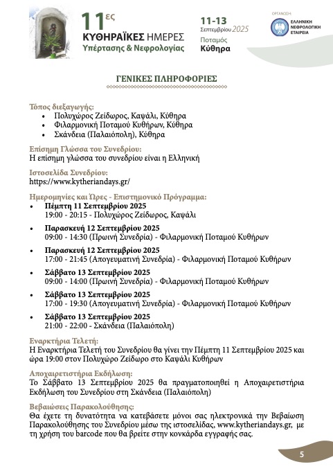 Οι 11ες Κυθηραϊκές Ημέρες Υπέρτασης & Νεφρολογίας που οργάνωσε στο νησί ο ιατρός κ. Νικόλαος Παπαγαλάνης διεξήχθει στην αίθουσα της Φιλαρμονικής η οποία διαμορφώθηκε κατάλληλα για τον σκοπό αυτό. Επιστήμονες από την Ελλάδα και το εξωτερικό συγκεντρώθηκαν από 11 έως 13 Σεπτεμβρίου για να παρουσιάσουν και να παρακολουθήσουν τις πολύ ενδιαφέρουσες διαλέξεις.