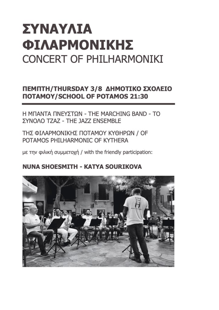We invite you to this year’s 2nd summer concert of the Philharmonic Orchestra of Potamos Kythera which will take place in the courtyard of the Potamos Primary School on Thursday 3 August at 9:30 p.m. The concert will be longer in duration and participation than the others, as apart from the band, the Philharmonic’s jazz ensemble will also participate with the friendly participation of two excellent performers, Nuna Shoesmith and Katya Sourikova.