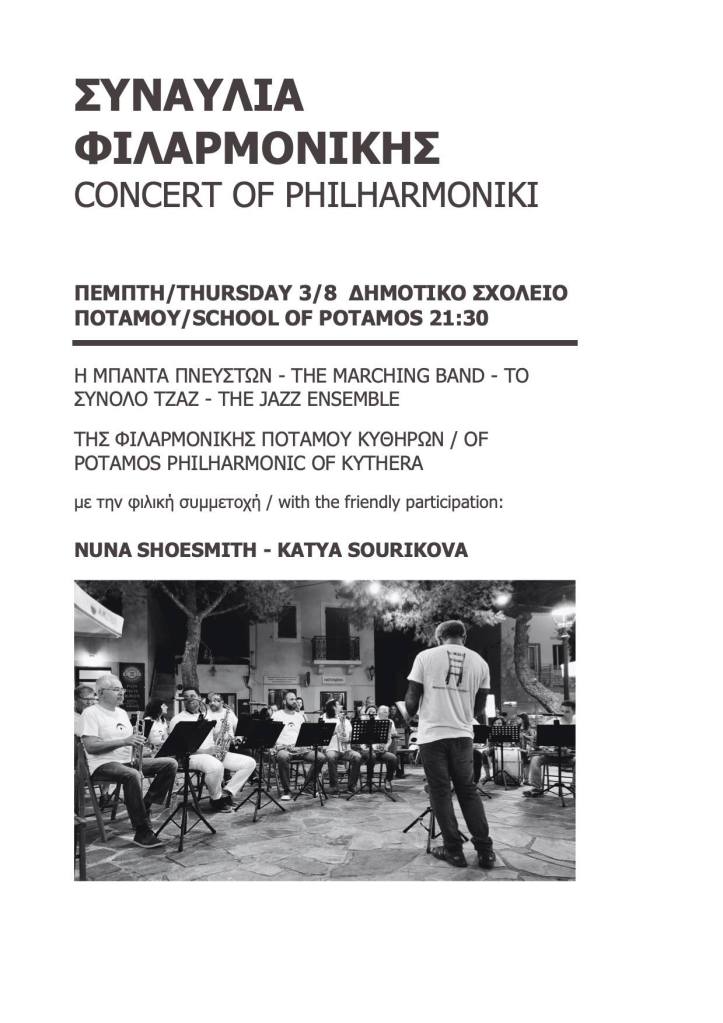 Σας προσκαλούμε στην 2η φετινή καλοκαιρινή συναυλία της Φιλαρμονικής Ποταμού Κυθήρων που θα γίνει στον προαύλιο χώρο του Δημοτικού Σχολείου Ποταμού την Πέμπτη 3 Αυγούστου στις 9:30 μ.μ. Η συναυλία θα είναι μεγαλύτερη σε διάρκεια και συμμετοχές από τις υπόλοιπες, μιας και εκτός από την μπάντα, θα συμμετέχει και το τζαζ σύνολο της Φιλαρμονικής με την φιλική συμμετοχή 2 εξαιρετικών ερμηνευτριών, της Nuna Shoesmith και της Katya Sourikova.